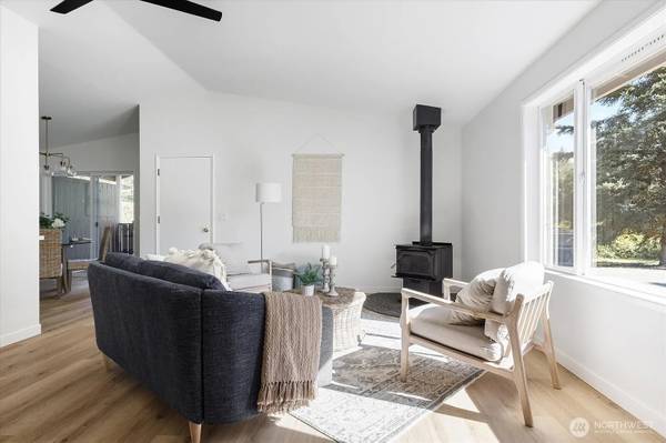 Perfectly situated on corner lot, dead end street, sits this 2 bed plus office, 2 bath home that has been beautifully renovated. Features include kitchen with quartz countertops, new SS appliances and a large walk in pantry. Nicely appointed primary suite with double closets and ensuite bath. Vaulted ceilings in main living areas create a spacious feel in this light filled home. Relax on the private covered deck off the dining area. Home has all new interior paint, luxury vinyl plank throughout, bathrooms, upgraded lighting and hardware. Garden shed outside for extra storage and fenced area that's ideal for your fur babies. This turn key home is just a short drive to downtown Oak Harbor, hiking and beach walks at Deception Pass State Park.