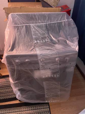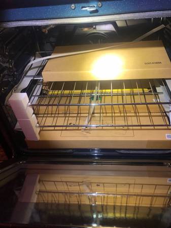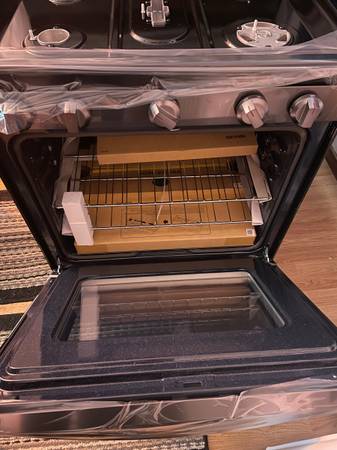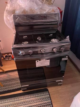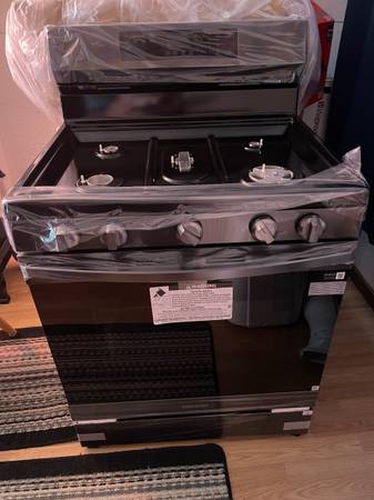 New, never unpacked. Bought for new home but deal fell through. All burner grates and oven parts still in boxes. Cost $1000 new, plus 5 year transferable protection plan. Kit for propane conversion also included. Beautiful black and stainless 5 burner range.