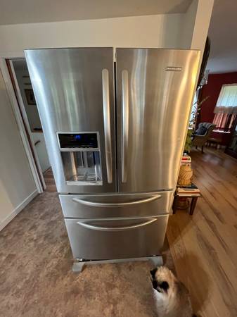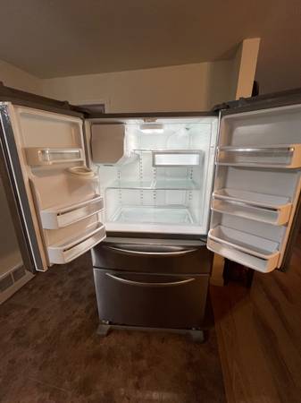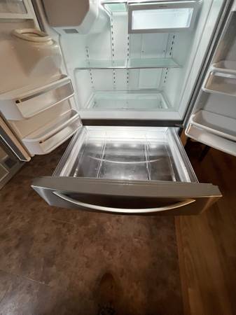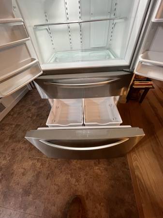 Side by side bottom freezer. Veggie drawer below side by side doors Works great, water dispenser works, great ice maker quit working. The movers who took it from our kitchen to the garage put a small dent in the veggie drawer. It is small. You will have to pick it up from my garage.