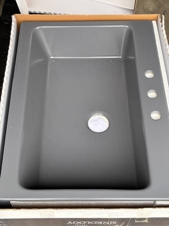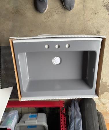 New Sinkology Drop-in farm sink, matte grey, 32” single basin, new in box, paid $475 + tax at Home Depot but we decided to go in a different direction.