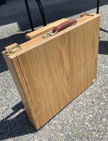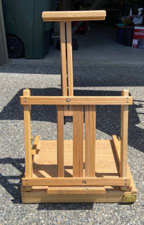 Beechwood with brass plated hardware. Light weight, easy to pack up and carry. Easel tilts from 0 to 90 degrees. Storage drawer. New cost +/- $95. In new condition, never used.