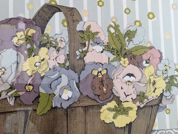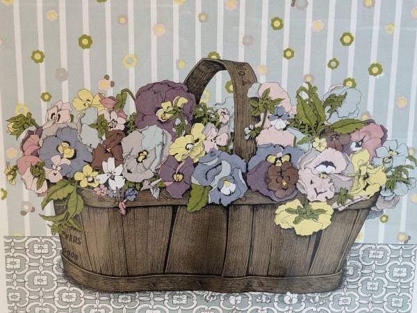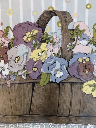 Ms. Davis is a contemporary artist from Guemes Island. The image has great pop, sharp lines and detail. It depicts her love of graphic art, sharp lines, and Japanese design. The title speaks to the power of perception: the pansies in the basket are more real than the pansies in the wallpaper but none of these flowers really exist being that they are creations in the 2D world. There is much more to this art than an image of pretty flowers. I love it but have run out of wall space.