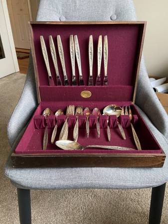8 place setting with serving pieces of International Deep Silver flatware in wood case.