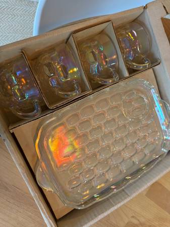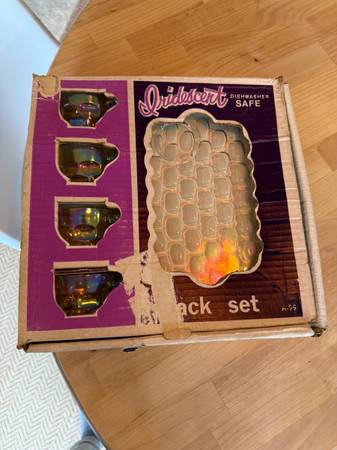 Incredible Vintage Midcentury Federal Glass Co. Snack Set - untouched in the original box - complete set of cups and snack trays. I am paring down my vintage collection during our home remodel. $60 CASH ONLY OBO takes this beautiful set. FCFS porch pickup from my home in Oak Harbor (near OHHS). I cannot ship or hold items.