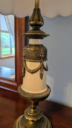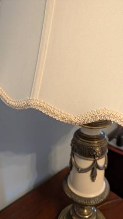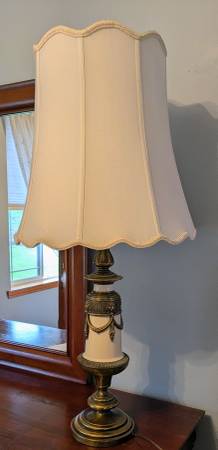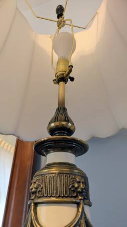 This wonderful lamp has been in our family for over 70 years. It is in amazing condition and is a great statement piece. It is 38" high x 18.5" at the widest point of the shade. Finished in off...
