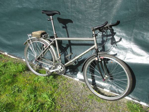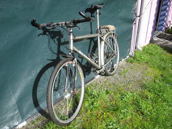 When I was a bike shop mechanic in 1996, I decided to build up a titanium mountain bike using as many titanium components as I could find. The resulting bike started with a Kona Hei Hei bare frame, welded at the Sandvik factory in Eastern WA state. The bike ended up with one major non-titanium part, a Ritchey black chrome front fork, and a few minor accessories that are not available in titanium.
