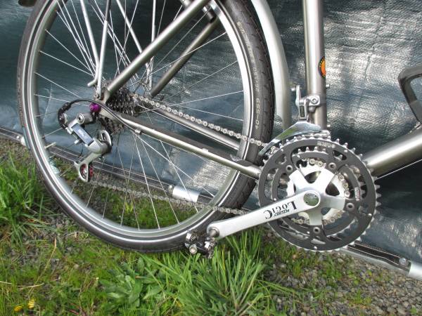 Ritchey crank arms installed on TNT titanium axle bottom bracket, four sealed bearings. New chain rings 46-36-26, titanium bolts, Ritchey clipless pedals.