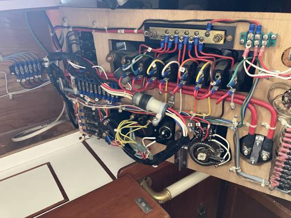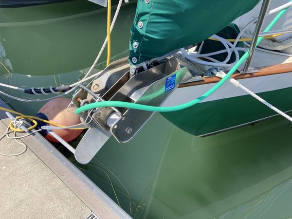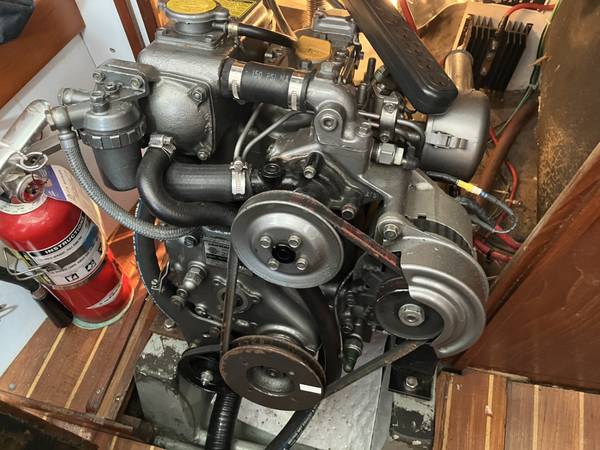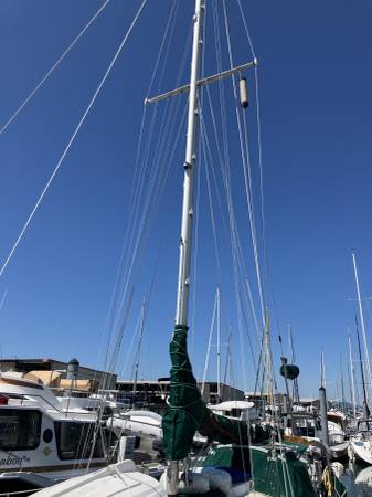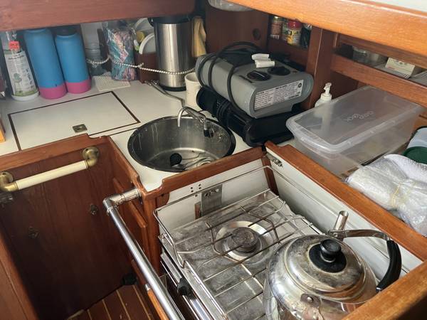 She is a cutaway full keel double-ender with high bulwarks along the weather decks and bow, makes for very sure footing in waves. She has a tiller for steering that can be flipped up out of the way when the cockpit is needed just for relaxing. Description: Galley port aft, nav desk stb aft w quarter bunk, settees in main cabin with drop down dining table, small space for porta potti, v-berth forward, nice large overhead hatch in coachroof for light and ventilation. Stainless steel opening portlights in cabin w glass lenses.