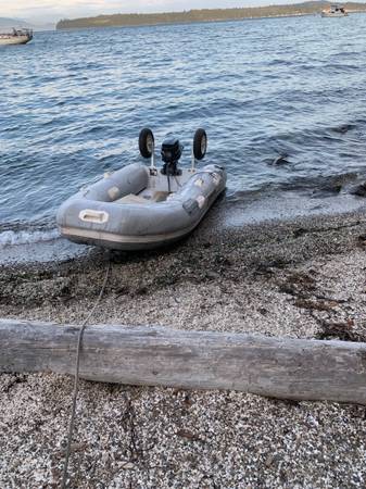The hard dodger is well designed but needs finishing. The decks could use coating. And the outside a light cleaning. The dingy does not leak air, has an aluminum bottom and large removable wheels on the rear. Outboard NOT included.
