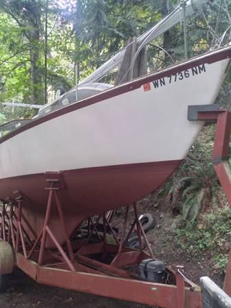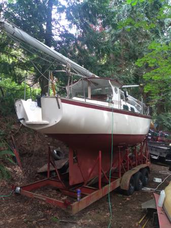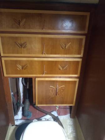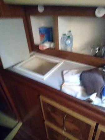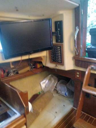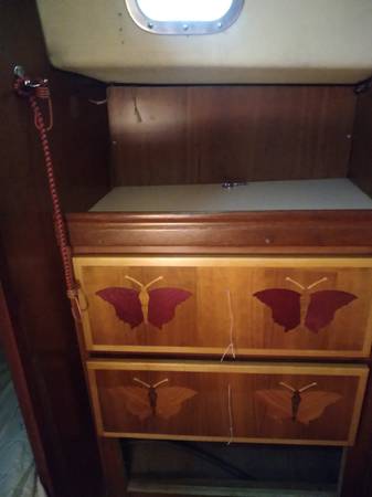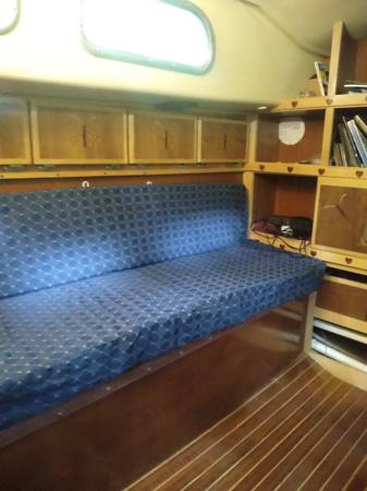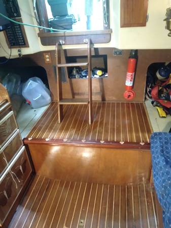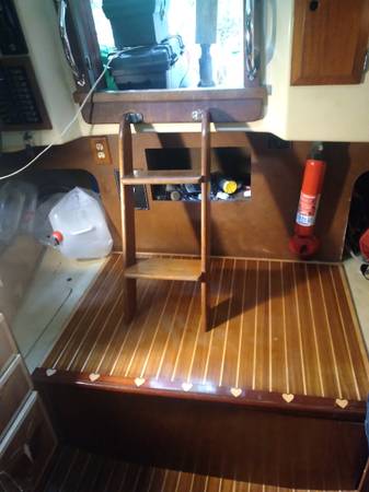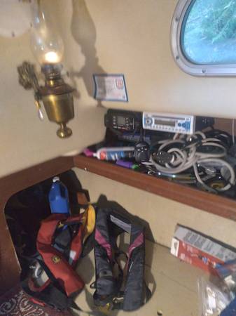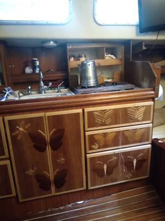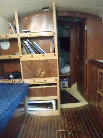 This is not your average old sailboat. It is on a VERY stout 3 axle trailer. 6 new tires and wheels. $2000 at Les Schaub.. 2 year old trailer battery.. pintel hitch included. No storage fees in the winter. I have owned this boat since 2000. We used it a lot. It was moored 5 years straight before we pulled it out of the water. 3 small blisters. Pearson had this issue figured out. There is no chopper under the gell coat. A very stout well made hull. Probably better than most new boats. No soft spots on deck or cabin. The interior is special. Very rare to see woodwork like this in a new or old boat. I cut the stern out to make a "sugar scoop". It makes getting out of the dingy easy. It has a vented propane locker and 2 in date tanks. An adapted 2 burner stove that does a better job than any marine stove I have seen. The galley has a Corian counter top and a nice stainless sink. A unique faucet. A soap dispenser. A salterwater faucet. All pressurized. The freshwater has a pressure tank so the pump runs very little. A 5 gallon hot water tank that is heated by the engine. 200 degrees ouch! Or 110 volts. The cooler has been cut in half. It is well insulated and will keep a block of ice for 4 plus days. Drains to bilge. A really nice set of pots and pans and dishes. The vee berth floor has been dropped a foot. No more banging your head. The toilet was just overhauled and flushes as new. A gusher pump for pumping overboard, eh. The floor has a nice grate over a glassed in shower pan with its own bilge pump and thru hull. The toilet is hard plumbed, no smelly flex hose. The main cabin bulkhead is very well done with a full bookcase and desk. The doors and drawer fronts are vertical grain cherry with sugar maple edges. Butterflys are inlaid wood of about 15 species. The floor and engine cover is real solid wood, not this paper thin veneer on modern boats. It has 2 quarter berths which we use for storage. A marine am fm with speakers in the cabin and cockpit. Vhf, furano radar, auto pilot. The anometer went out decades ago and the depth sounder last week. Anchors are about a 35 lb plow on the bow with about a hundred feet of chain and a lot of line. The anchor locker is glassed in and vented over the side, no more more mud in the bilge. Stern anchor is a large Danforth and at least a hundred feet of line. The bilge pump is 2000 gallons an hour. Most interior lights are led. The head sail is roller furling. Works well. About 150%. A handed on jib that is good but stained. Chrisp main, loose footed. A like new colorful geniker. 2 spinaker poles.. All lines to cockpit. Large 2 speed winches on new winch boards. More winches in spares along with a ton of stuff. Campbell sailor prop with new zinc.. carbon shaft seal so no leaks.. Atomic 4 engine. New starter. Almost new 90 amp alternator. Electronic ignition with new cap and rotor. New stainless electric antifreeze pump.. But wait, you want a testrone engine. I have a good running 2 cylinder yanmar with trans that goes with it.. i would rather have the atomic 4. It is quite. At idle you can't hear it running. No vibration.. I do have sound proofing. The only diesel advantage one quart an hour for the diesel, one gallon per hour for the gas.