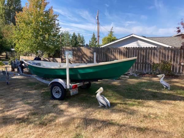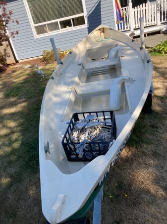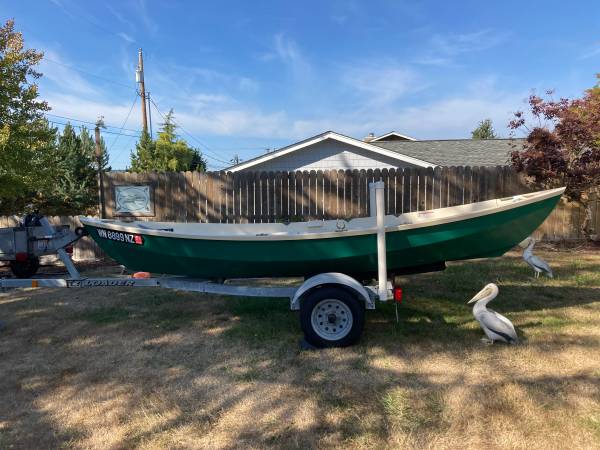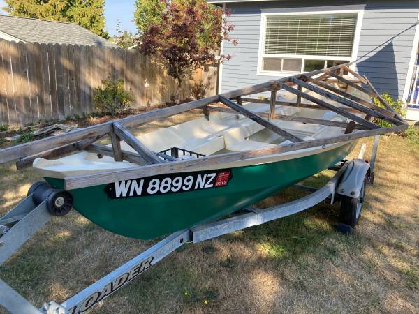 This is a 15' wooden double or single station rowing vessel built by a local boat builder and based upon a Phil Bolger design called "Sweet Pea". It is hardly used and in near mint condition. Comes with a very nice EZ Loader trailer. Also comes with a well designed wooden framework for covering with a tarp. This is a very nice package, priced at $1,750.00. Pick it up now at this seasonal low price and be ready for Spring boating. See pics and call me.
