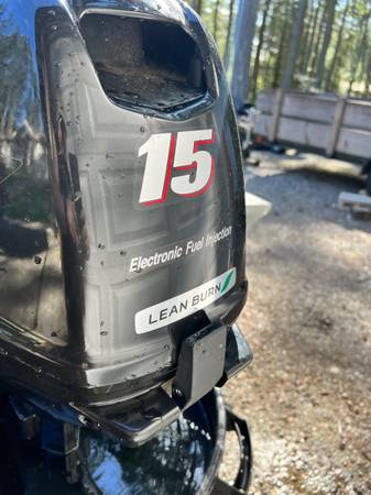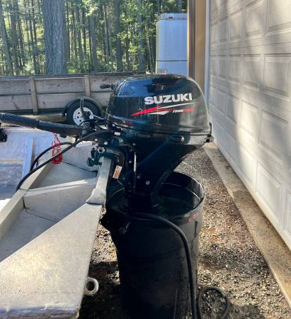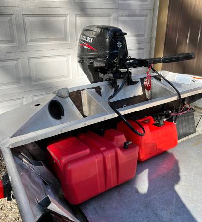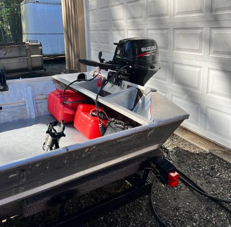 Welded hull semi-v aluminum boat with trailer and 15hp Suzuki 4-stroke outboard motor. Has two fuel tanks, four rod holders, bow line, two distress flags, oars, a battery and a large anchor. Titles...