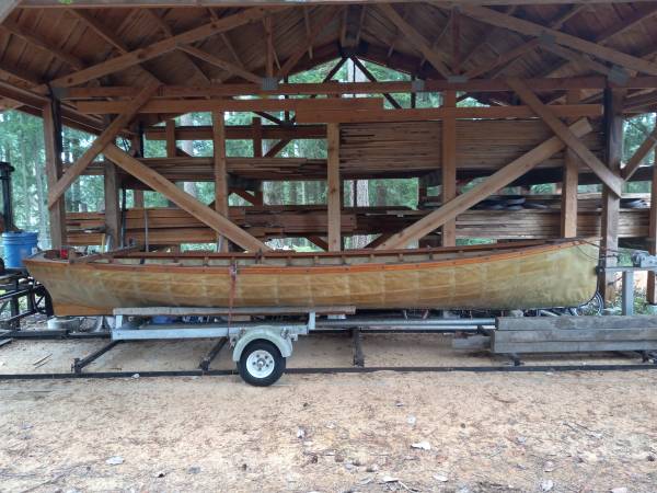 17' Whitehall rowboat. Lightweight skin on frame construction. Can be rowed by one or two. Includes trailer and 4 oars.