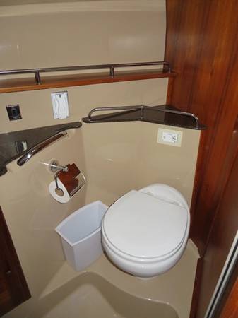 Spacious main head with electric toilet, sink, and enclosed shower