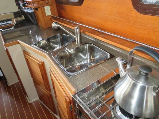 Galley to starboard with double stainless sinks, LPG stove/oven, and 12VDC refrigerator