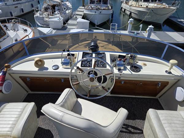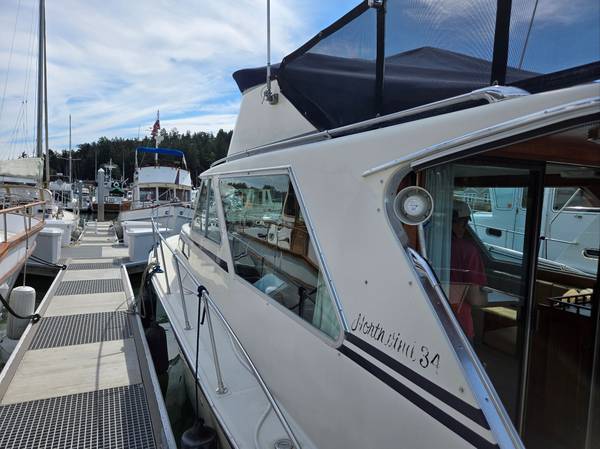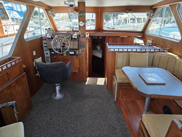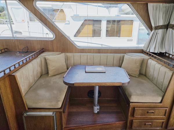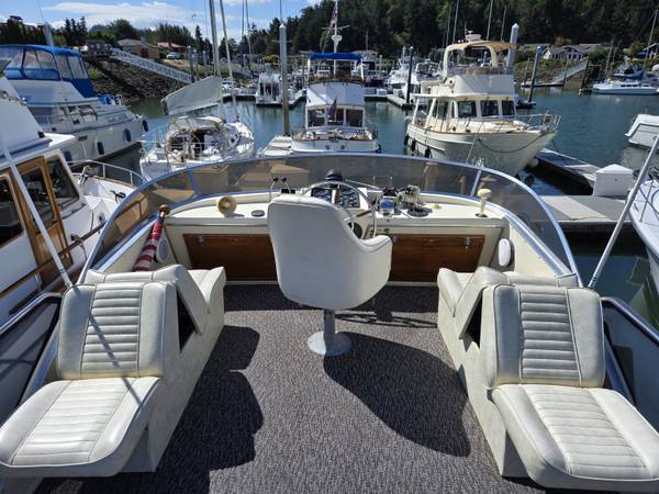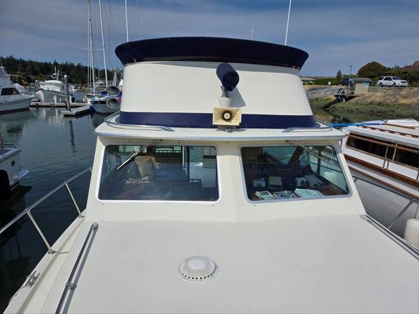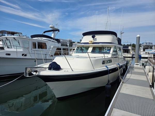 Proudly built in Bellingham, Washington, this rugged and spacious flybridge sedan is powered by reliable twin 454 V-drive engines with under 1,000 hours of use.