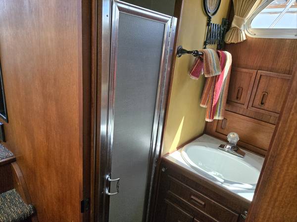 The bright galley-down layout includes a FULL SIZE AC/DC refrigerator, 2018 electric stove and oven, microwave, and ice maker. The forward stateroom is complemented by a roomy head with a separate shower stall.