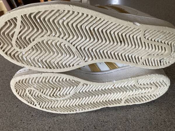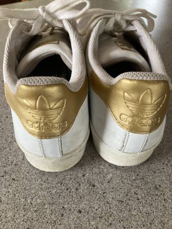 Adidas Superstar Gold 3 Stripe Shoe - Size: Men’s Size 7 or Women's Size 8.5 - Color: White with Metallic Gold - PCI 789002 - Condition: Good 115
