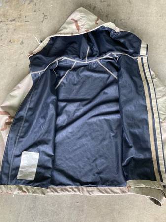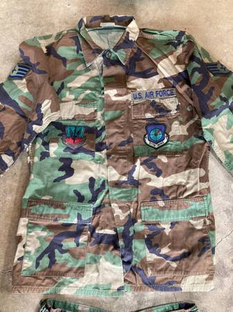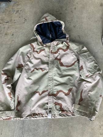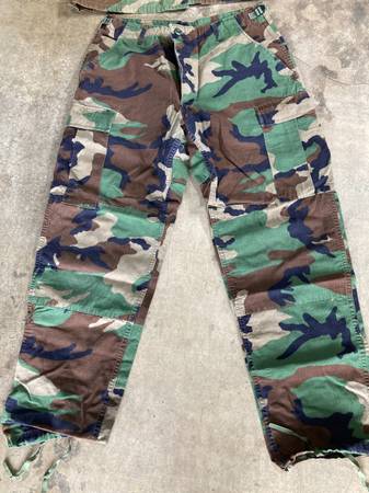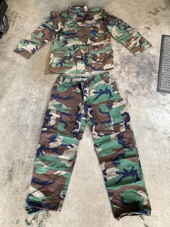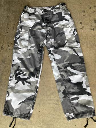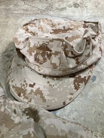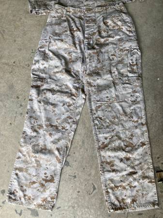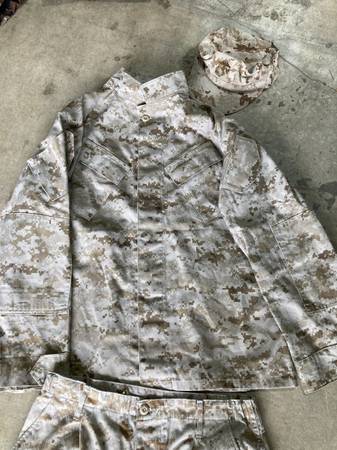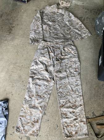 1. Digital desert camo (Marines) - $45 - Long sleeve shirt - Large Regular - Pants 31-35" - Medium Regular - Cover - Large 2. Hooded camo jacket - $20 - size: Large / X-large 3. White/Gray camo...