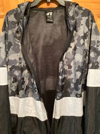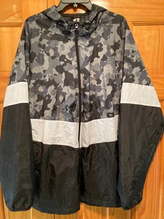 1. Russell hooded windbreaker jacket - $15 - Size: Men's 2XL - Color: Black/Gray Camo print - Full zip, 2 front zipper pockets 2. 32 degrees hooded rain jacket - $15 - Size: Men's XXL - Color: Black...