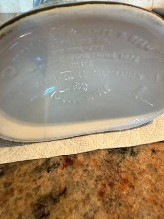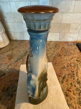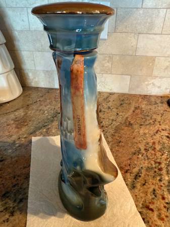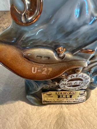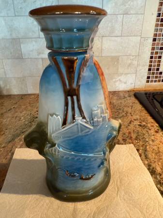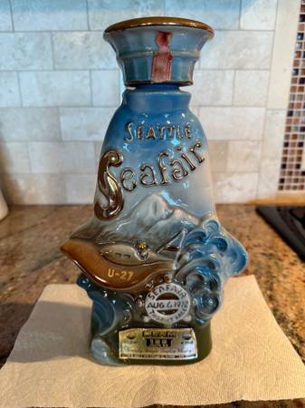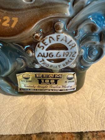 This 1972 decanter represents Seattle Seafair Trophy Race August 6, 1972. All labels are attached as seen in the pictures. This decanter is elegant with the blue sea, waves of gold painted writing. Front top reads “Seattle Seafair“. Front bottom on steering wheel reads “Seafair, August 6, 1972, trophy race. The gold label at the bottom of the front is in excellent shape. You will also see the special space boat on the front and the person in the boat shows his gold helmet that reads “U 27“. On the back of the decanter, you will see boats, bridges, space needle. The decanter is empty.