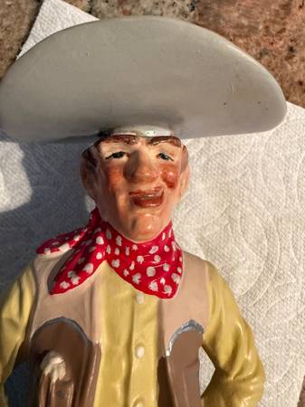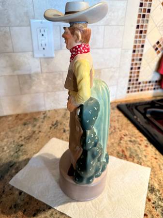 The cowboy decanter is hand painted. This is a vintage piece, nearly 60 years old. There are no nicks and the bottom of the cowboy hat is actually the cork. The decanter is empty. The bottom of the...