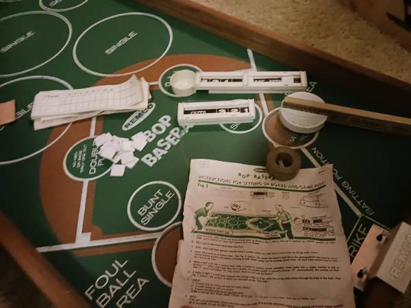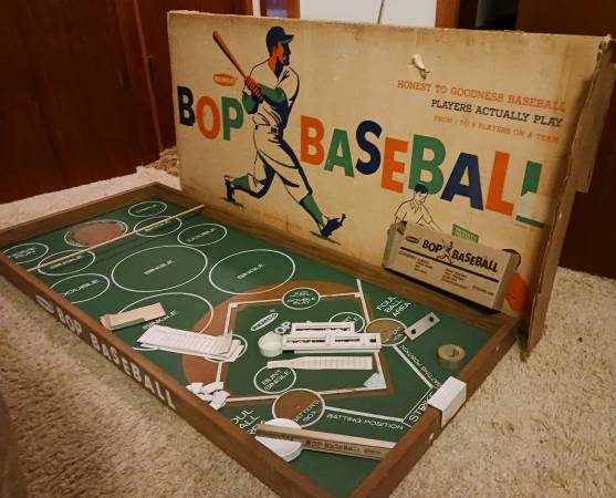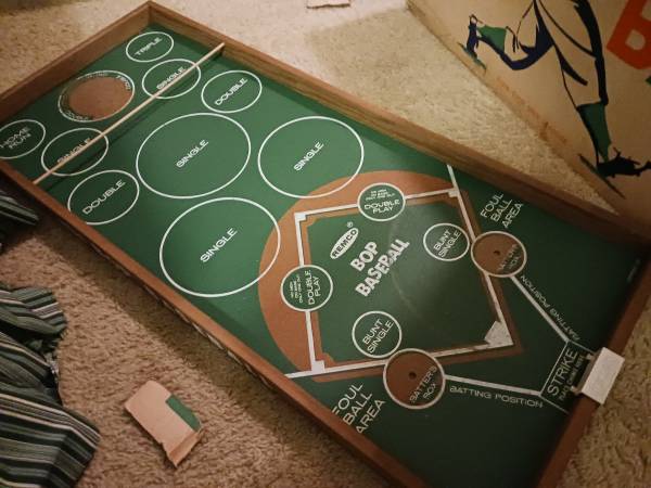 Vintage 1961 Bop Baseball game by Remco. Good condition with no breaks or cracks in the wood frame, and non-warped. There is some scuffing around the pitcher's mound and batter's boxes. Includes all the original pieces: bat, “ball”, out counter, hit and run counter, strike guard, and marking pieces for counters. Also included are the original parts box, the instructions, and the last pages of the score pad. The cardboard box has obvious wear. The board is approximately 49” L x 22” W x 2.5” H.