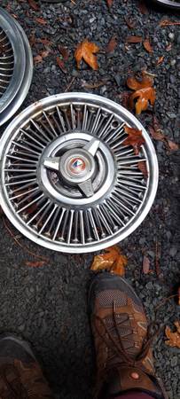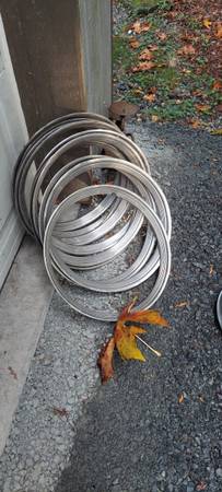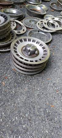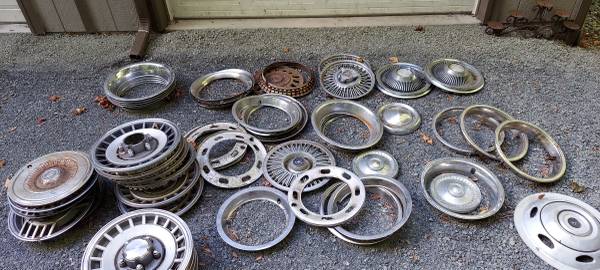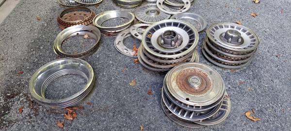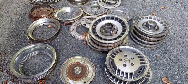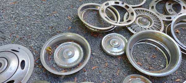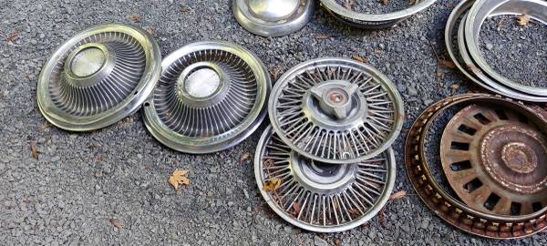 Numerous Wheel covers and rings in fair to good condition for use or wall art.