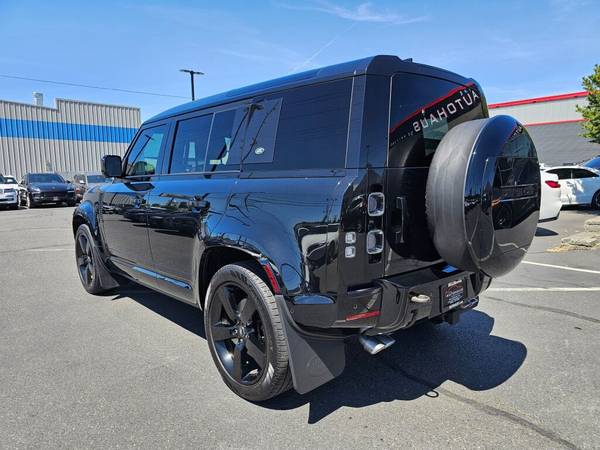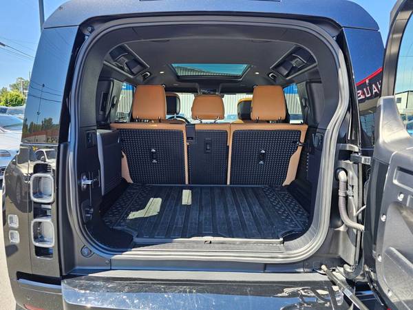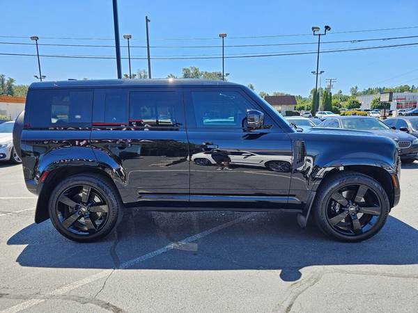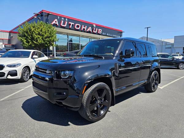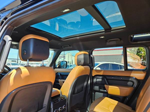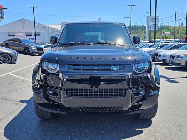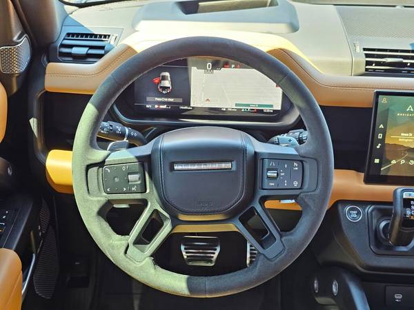 This Land Rover Defender 110 V8 is available in Santorini Black Metallic with Vintage Tan interior. Connectivity Group includes: Electronic messaging assistance (voice operated), Hands-free phone call integration (voice operated), Power outlet(s) (USB front), Power outlet(s) (USB rear), Power outlet(s) (USB-C front). Safety includes Front wipers (rain sensing), Front wipers (speed sensitive), Front wipers (variable intermittent), Airbag deactivation (occupant sensing passenger), Front airbags (dual).