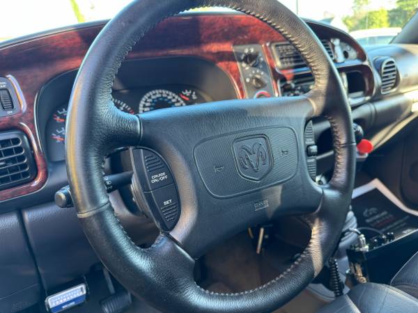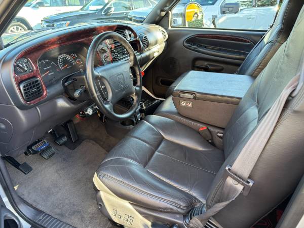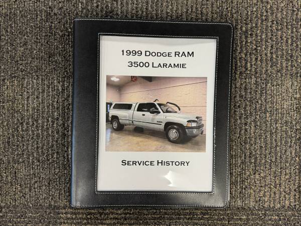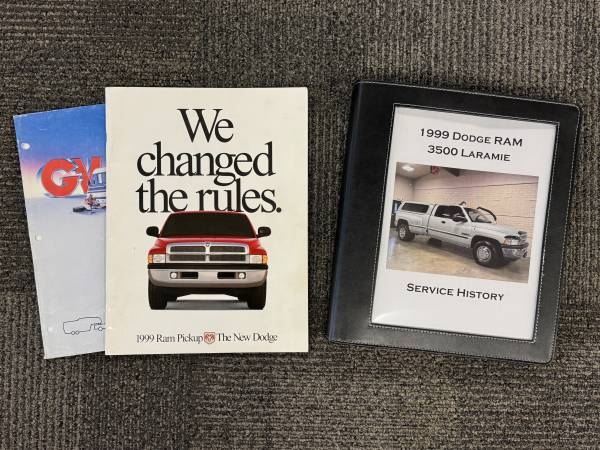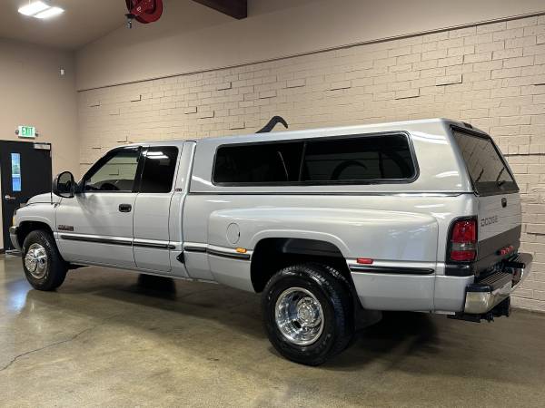 One family owned 1999 Dodge Ram 3500 Laramie Quad Cab Long bed Dually 5-Speed Manual. Sold new in Anacortes, Washington, mechanic owned, rear wheel drive dually, lots of extras and extremely rare. Finished in Light Driftwood Metallic over gray leather and powered by a 5.9-liter Cummins turbodiesel inline-six, linked to a five-speed manual transmission with a Gear Vendors overdrive unit. Truck purchase comes with a fresh service and six brand new tires. Video walk-arounds are available upon request. Please reach out to one of our team members to schedule a showing.