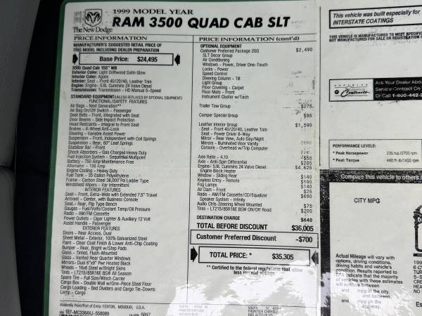 1999 Dodge Ram 3500 Laramie SLT DRW Cummins 5.9L 24V Turbodiesel 5-Speed Manual HD Light Driftwood Satin Glow Ram 3500 Laramie SLT DRW, 4D Quad Cab, Cummins 5.9L 24V Turbodiesel, 5-Speed Manual HD, RWD, Light Driftwood Satin Glow, 4.10 Axle Ratio, 8-Way Power Driver Seat, ABS brakes, Air Conditioning, Anti-Spin Differential Axle, Auto Day/Night Rear-View Mirror, Auxiliary Springs, Bodyside Molding, Camper Special Group, Carpet Floor Covering, Deluxe Convenience Group, Engine Block Heater, Front Air Dam, Front Floor Mats, Glove Box Lamp, Heated door mirrors, Illuminated Visor Vanity Mirrors, Instrument Cluster w/Tachometer, Leather 40/20/40 Split Front Bench Seat, Leather Interior Group, Leather-Wrapped Steering Wheel, Light Group, Map/Courtesy Lamp, Mini Overhead Console, Overhead Console, Platform Hitch Receiver (Class IV), Power Convenience Group, Power Door Locks, Power Windows w/Driver's 1 Touch Down, Premium Cloth 40/20/40 Bench Seat, Quick Order Package 2GG, Remote Keyless Entry, Right Sun Visor Mirror, Sliding Rear Window, SLT Decor Group, Speed Control, Stabilizer Bar, Steering Wheel Mounted Audio Controls, Tilt Steering Column, Trailer Tow Group, Travel Convenience Group, Trip Computer, Underhood Lamp.