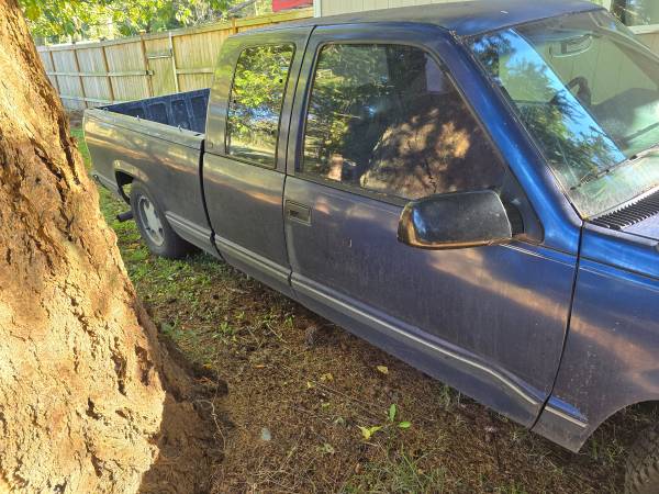 95' Chevy C1500 has minor rust on the hood and the badges are all gone save one, one dent in the passenger side panel and rear fender, the transmission is a manual. Also, windshield damage driver side. No A/C. Just heat. Odometer: 277282