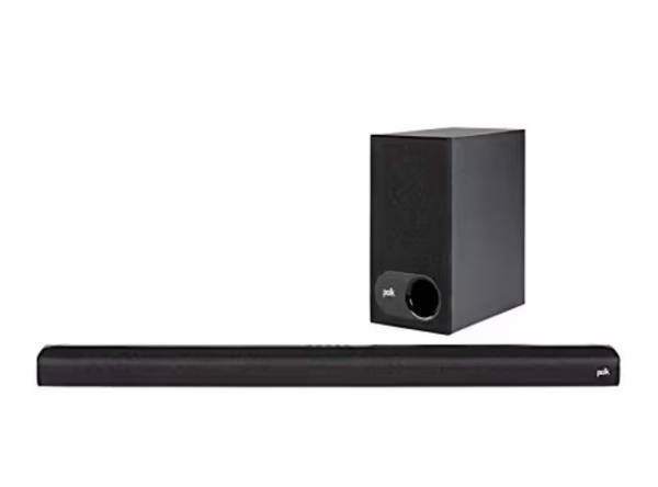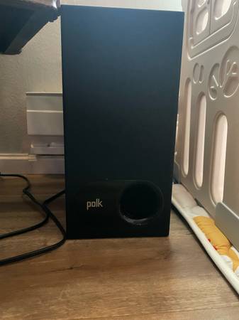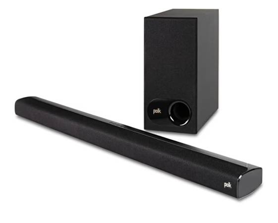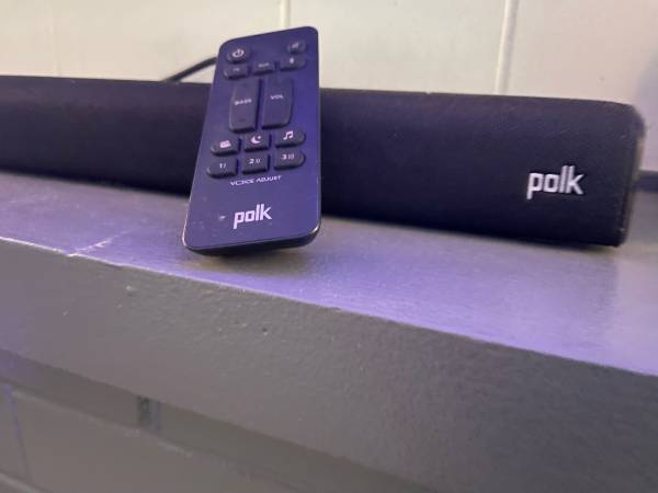 Polk Audio Soundbar comes with Subwoofer and Remote. Thin design with easy wired set up via HDMI or ARC. Soundbar about 35” wide by 2” tall. Great sound!