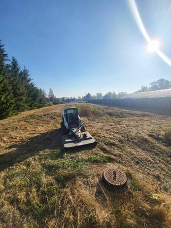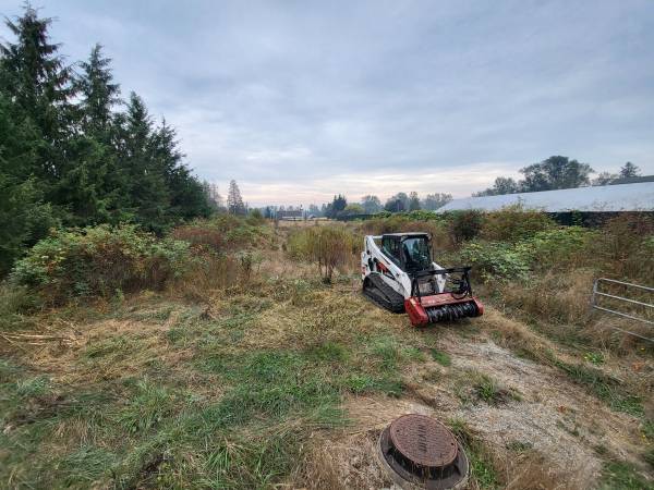 Get your land back! Make quick work of whatever has taken over your yard - blackberry bushes, alder trees, scotch broom, tall grass, salmonberry etc. No burning, raking or hauling - only mulching. You'll wonder where everything went. Get the job done right the first time. Brush cut and mulch heavy brush such as blackberries flat to the ground. Save time, money and most importantly - a headache. Properly equipped with a tracked Bobcat T590 that has the right amount of horsepower to get the job done right. My BrushCat rotary cutter/brush hog and Fecon forestry mulcher are top of the line which assures you a professional and thorough mulching. The best part about the Fecon forestry mulcher is that it mulches flush to the ground, leaving a beautiful finish. Increase your property value instantly and make the neighbors happy. Best of all, the compact Bobcat T590 is nimble in tight and hard to reach places. Also reach as high as 12 feet up with the extended arms.