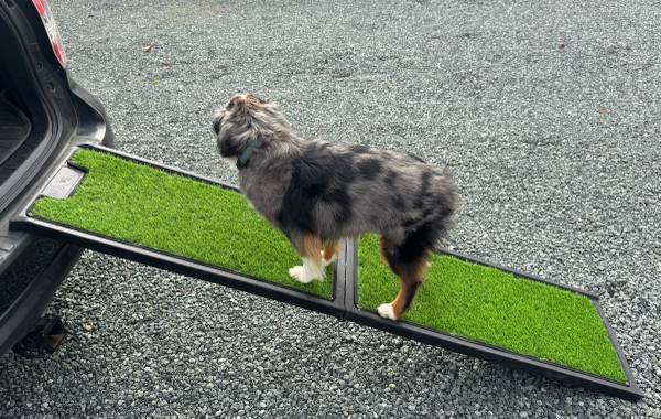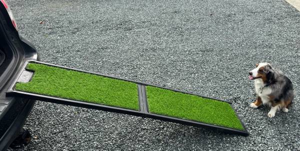 As dog's age, getting in and out of the car can become difficult, painful, and hard on your dogs' body. Keep them going and provide the help they need with Gen7Pets® Natural-Step® Ramp for Vehicles. The Natural-Step Ramp features a poly-grass surface that provides a much-needed grip for your dog to get up and down the ramp easily. Designed with your pet's safety in mind, the Natural-Step Ramp has durable rubber grippers on both ends of the ramp that keeps it secure and in place while in use. The regular-sized ramp features a safety tether latch that attaches to your cargo area's anchor to provide extra security while the ramp is in use. The Mini-sized ramp does feature a safety tether. When done, fold the ramp in half and the automatic locking clip keeps it from opening accidentally. A convenient rubber-grip handle and the lightweight design make it easy to store in your cargo area or under the back seat of your car.