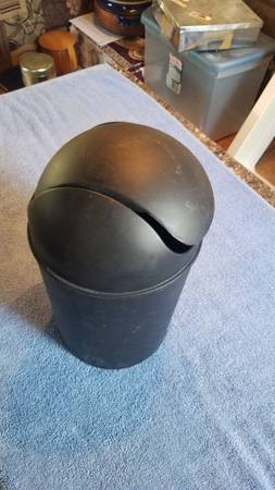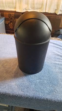 Small flip top trash can perfect for a small bathroom or on top of the dryer. 13"tall 7 1/2" wide.