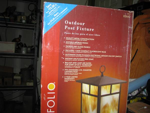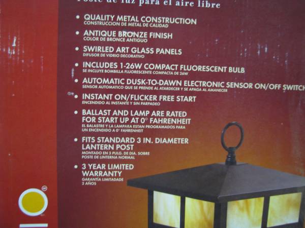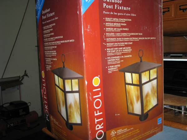 New outdoor pole lamp. Fits 3" pole. Auto off on and energy efficient Bulb. Metal construction a great addition to drive or walkway. four available 110V