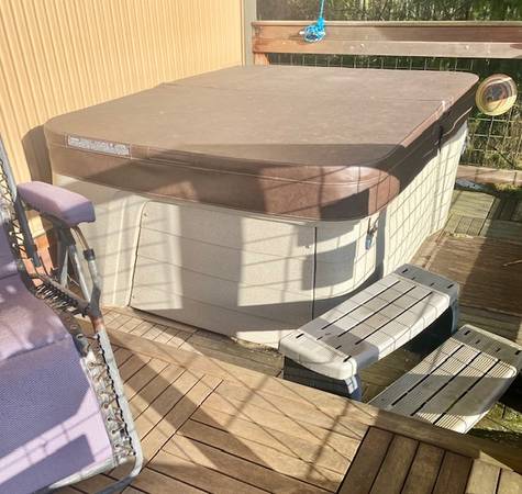 Freeflow Spa "Azure" installed Nov. 10, 2021. Can operate on 115 corded power or be hardwired to 230V. Weighs 326 lbs. Capacity 225 gal. Used 3 years in single-person household. Owner broke her leg in a catastrophic manner last December and it has sat unused for the past year. Don't foresee being able to climb in and out of it anymore, so it should go to someone who can use it. Includes steps and cover. Cost $6,500 from Olympic Hot Tub in Everett. Asking $2,000. On Whidbey Island.