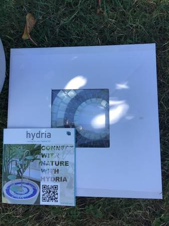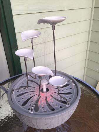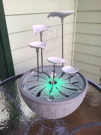Water fountain with remote to turn on or off change colored lights and different water heights. Fountain or use petals. New. Open box item.
