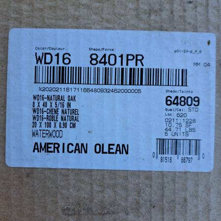 20x boxes of American Olean, Natural Oak WD16. 8"X40" X5/16 floor tiles.