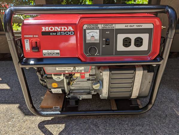 Honda EM2500X portable generator, gas powered. Good for camping, backup power, off the grid uses. Has dual AC 120Volt outlets an DC 12Volt terminals to charge batteries for cars, boats, RV, etc. Rated to run up to 8 hours on a tank of gas. Only has been used for occasional back up power during outages. Have replaced with a whole house generator.