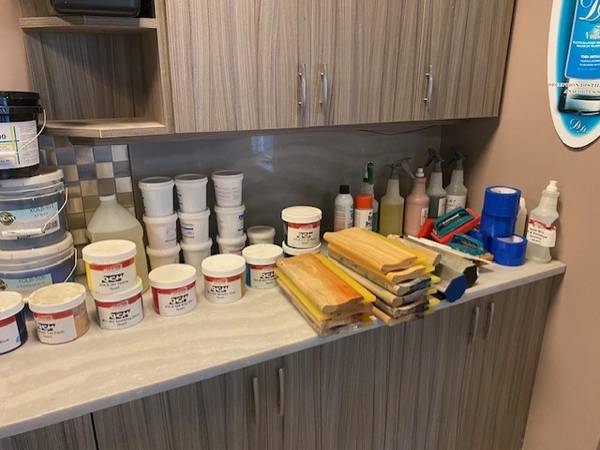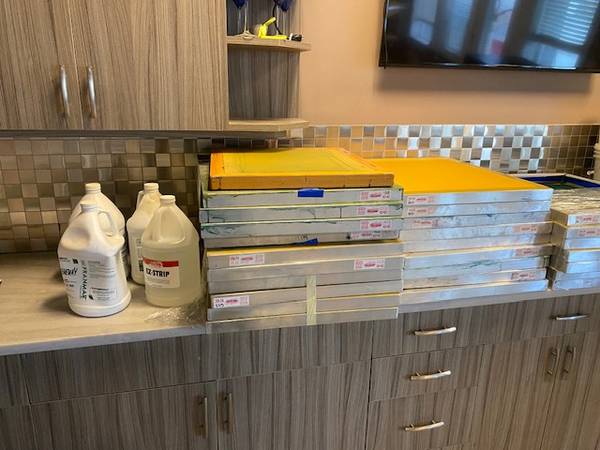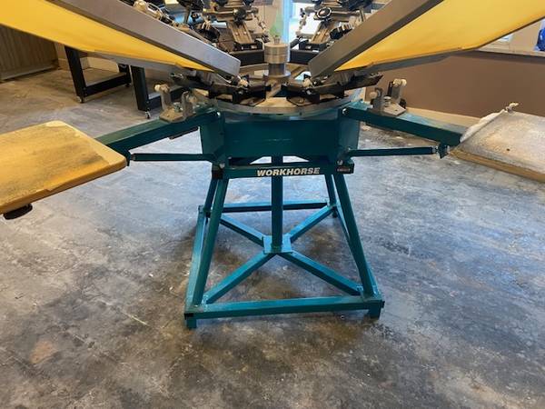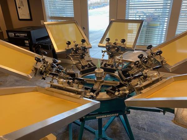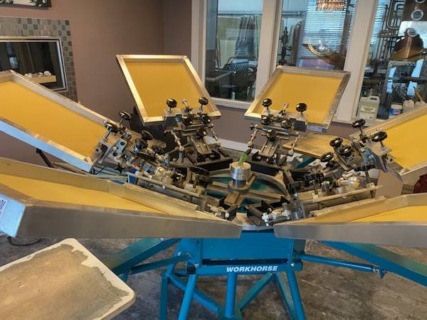 Workhorse six station screen print set up with conveyor dryer exposer box lot of supplies and screens Cost $12000. Sell for $4500. or make offer.