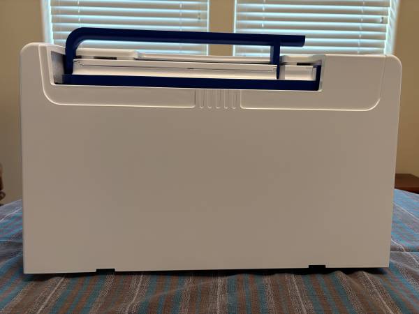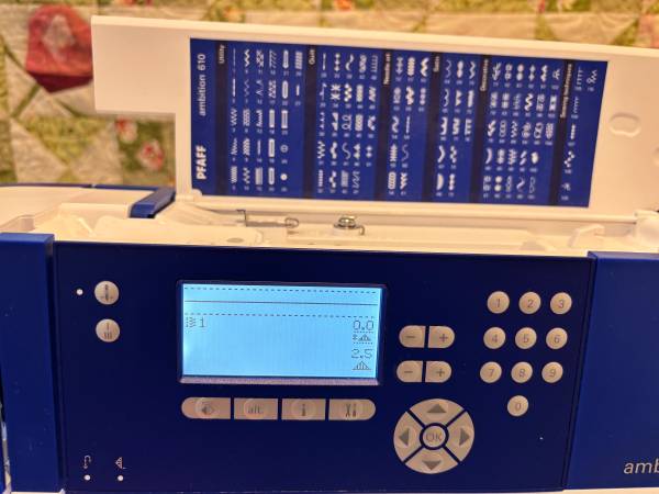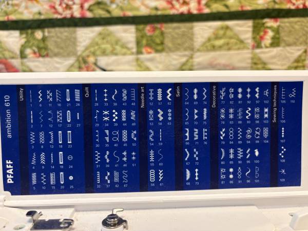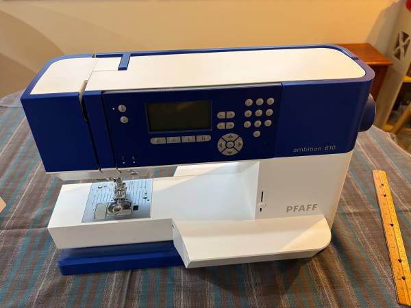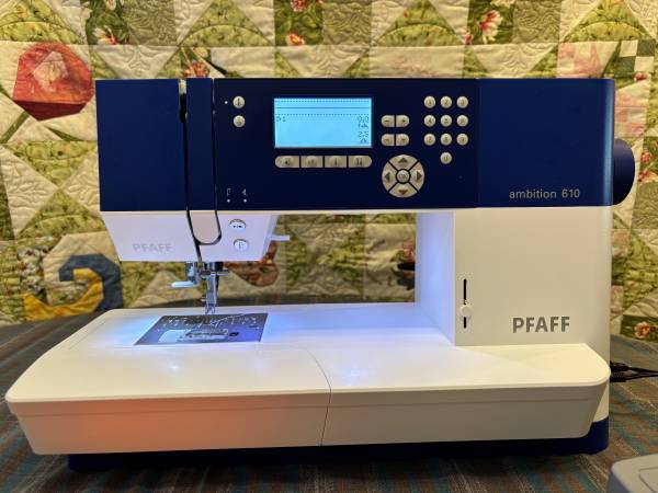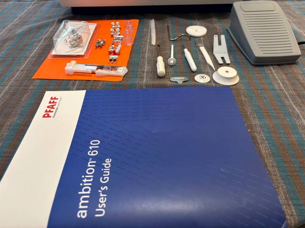 This beautiful sewing machine was used by the original owner for just 18 months. It comes complete with all the original accessoriies, plus extra bobbins.The Pfaff Ambition 610 is perfect for quilting and craft projects as well as general sewing with it's large sewing space of 7.9 inches from the right of the needle. The IDT dual feed system unique to Pfaff preceisely feeds all types of fabric evenly from the top and bottom for perfect stiching. With 110 built in stitches, it is easy to sew elastic, trims, stretch fabrics, and perfect buttonholes every time. Manual is included.