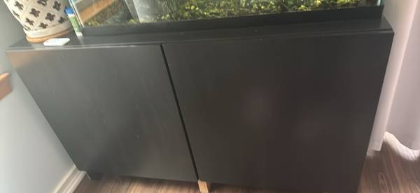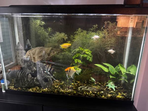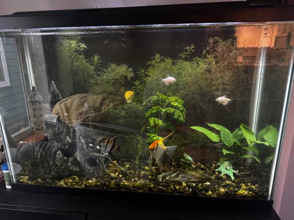 45 gallon 15 with all supplies for a maintenance and for a freshwater fish. I have beautiful freshwater fish if you want to purchase them everything is sold as one. I also have a cabinet that will hold the fish tank and has shelves in storage area for supplies