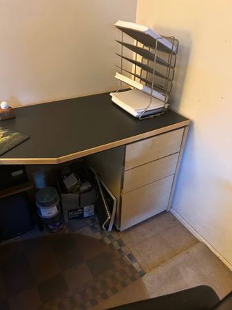 This is a beautiful solid wood desk L-shaped and it comes with the chair in the picture 200 for both in perfect shape. Just don’t have space call .