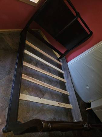 This is a used wooden bed frame originally bought from Z-Gallery. It's in good condition with a small hairline fracture on part of the headboard (see photos), but this has no impact on the sturdiness of the bed. It is solid. We used it for years and my wife recently decided she was ready for a change so we are selling it. This will hold a standard queen size mattress.