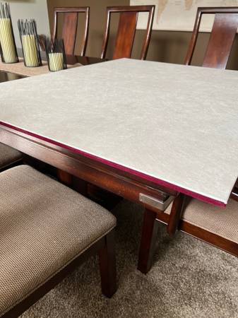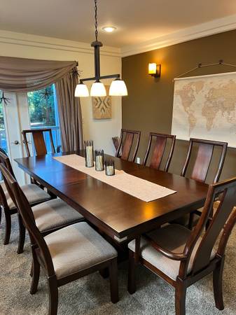 Get ready for the holidays with this gorgeous dining room set. Table has two 16” leaves which expands the 72” table to either 88” or 104”. Beautiful detailing on top and corners and a unique base.