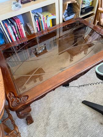 Traditional style Glass top Coffee Table. Used but nice and very sturdy. 50 in L x 32 in W x 20 in tall.