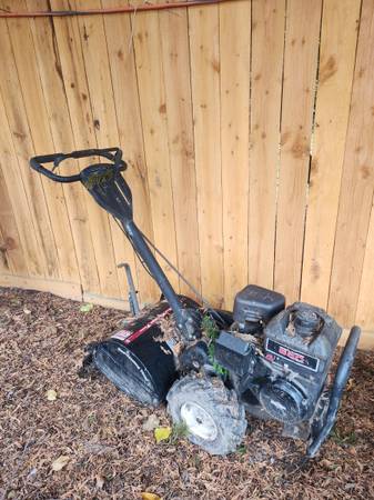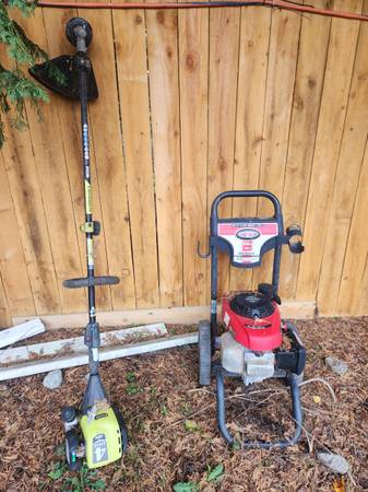 Cleaning my yard. All together - as-is - 100. 1. Troy bilt Pressure washer works but with low pressure. Pressure relief valev changed will solve the issue. 2. Generator -sold. 3. Tiller motor is fine but tranny needs adjustment inside for mobility. Its a safety pin inside. Tiller function works. 4. Simpson pressure washer motor works, pressure washer unit needs repair. 5. Ryobi Weed wacker 4 stroke - needs repair.