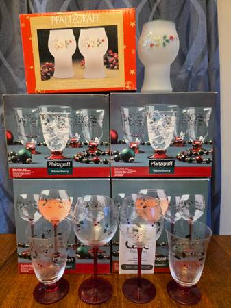 There are no chips in any of the glass however, a couple of the water goblets are missing some of the red paint on the base. Will send additional photos on request.
